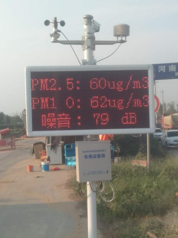 在該項目部門口,豎著一塊電子屏,上面不僅顯示氣溫、風(fēng)速、風(fēng)向、濕度和噪音,還顯示PM10和PM2.5濃度,這就是新近安裝的揚塵在線監(jiān)測系統(tǒng)。該揚塵在線監(jiān)測系統(tǒng)具有實時在線監(jiān)測污染顆粒物濃度、噪聲強度、氣象參數(shù)功能,24小時在線連續(xù)監(jiān)測,超過報警值時還能自動啟動監(jiān)控設(shè)備。