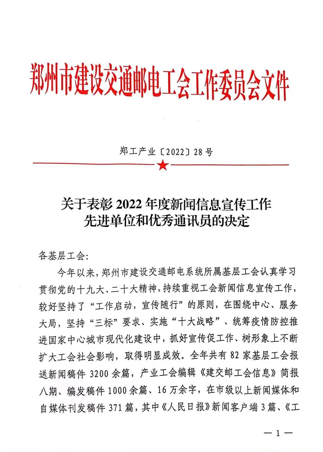 近日,鄭州市路通公路建設(shè)有限公司工會被鄭州市總工會交通郵電工會評為2022年度新聞信息宣傳工作先進(jìn)單位。