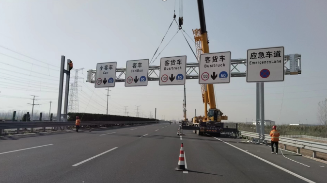 近日,由騰盛公司負責的G107東移與連霍高速相交高速段順利完成門架式標志牌的安裝。